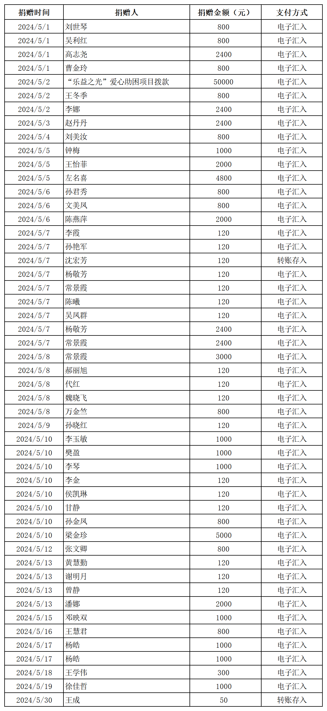 2024年張掖市慈善協(xié)會(huì)積極搭建愛(ài)心平臺(tái),得到廣大愛(ài)心人士和愛(ài)心單位積極響應(yīng),踴躍捐款捐物,現(xiàn)將(2024年5月1日--5月31日)接收到的銀行轉(zhuǎn)賬收入公示如下:
