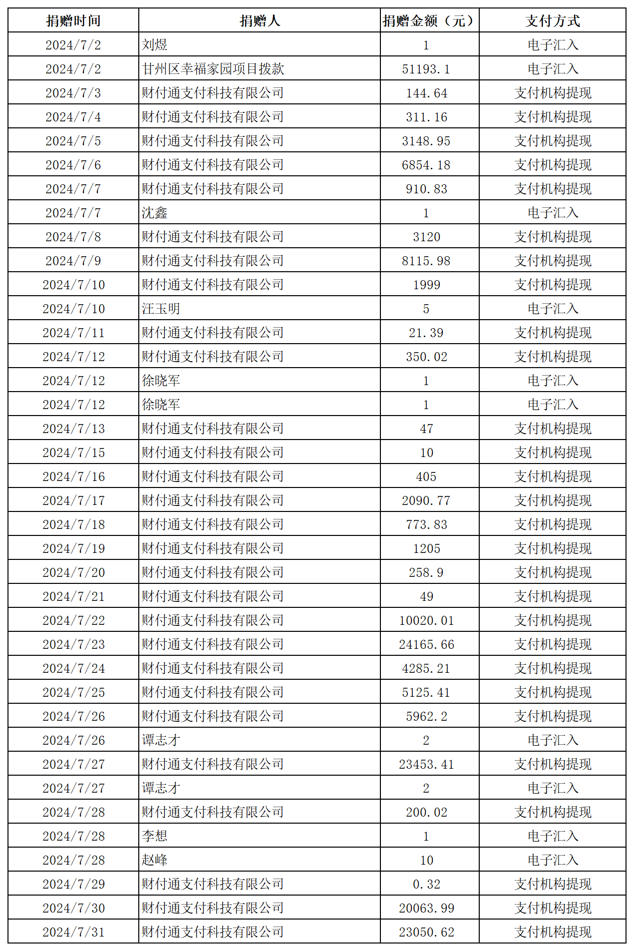 2024年張掖市慈善協(xié)會(huì)積極搭建愛心平臺(tái),得到廣大愛心人士和愛心單位積極響應(yīng),踴躍捐款捐物,現(xiàn)將(2024年7月1日--7月31日)接收到的銀行轉(zhuǎn)賬收入公示如下: