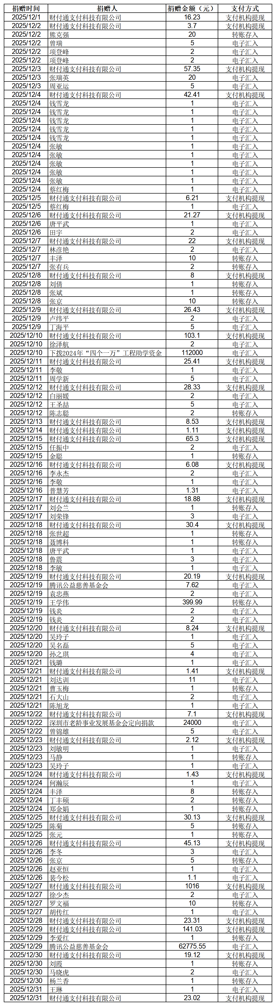 2025年張掖市慈善協(xié)會積極搭建愛心平臺,得到廣大愛心人士和愛心單位積極響應,踴躍捐款捐物,現(xiàn)將(2025年12月1日--12月31日)接收到的銀行轉賬收入公示如下:
